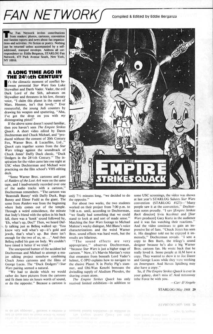 Edited by myself and Chuck Michael when we went to the University of Southern California cinema school, "The Empire Strikes Quack" started out as a little exercise in editing practice. It features video from all three original Star Wars films edited to the complete soundtrack of the classic Warner Bros. Cartoon, "Duck Dodgers in the 24 1/2 Century". It turned out to be a mammoth undertaking resulting in over 35 hours of editing time in the post production building.
